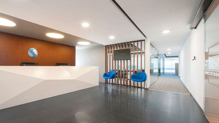前臺的設計:在設計師眼中前臺是客戶了解企業的第一個窗口,故此一定要簡單、便捷,這也是設計師對金融公司辦公室前臺的基本定義,這樣的目的就是希望,讓客戶以最快的速度對企業有一個直觀的了解,暢通無阻的動線是保證客戶與企業之間交流的重要通道。