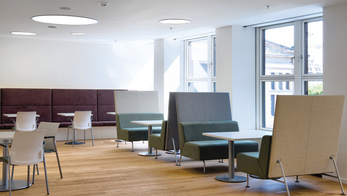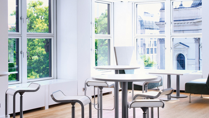 休息區域的設計:在這里員工可以坐在這里,什么都不用想,看看窗外的美景,或陶醉、或發呆、或默默無語、或與人交談,這也是設計師希望看到的,在這里生活的壓力都被陽光所驅散,在這里一切都是如何的透明,讓員工在這里可以休養生息。