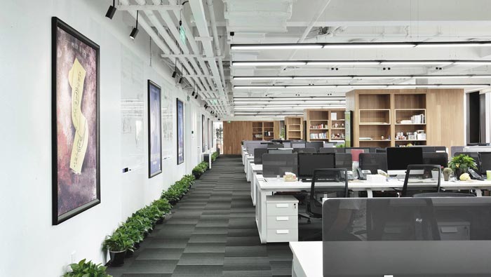 辦公區(qū)域的設計:設計師在設計的時候,對辦公空間采用開放式的設計手法,在設計師看來開放式的設計是現(xiàn)在的一個主流趨勢,同時設計師將每一個辦公區(qū)域都按照部門進行劃分,在每一個部門之間都放置儲藏柜,儲藏柜不僅可以起到容納的作用,同時也將兩個部門進行分離,這樣既可以保證空間的開放性又可以保證空間的私密性。