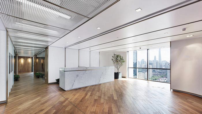 前臺的設計:設計師在設計的時候,以外部動線為起點、依次向內,在設計師看來前臺首先要解決的就是方便與便捷,故此設計師希望通過內外的相互連接,讓客戶可以自然而然的進入企業(yè),這樣就很好的解決了渠道的問題,其次就是前臺區(qū)域坐落在落地窗的旁邊,陽光的投射讓客戶感受到企業(yè)的實力。