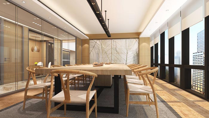 會(huì)議室的設(shè)計(jì):此次給人的第一感覺(jué)好似有茶道的感覺(jué),原因就是設(shè)計(jì)師與客戶(hù)都有一個(gè)共同的愛(ài)好,就是茶道,設(shè)計(jì)師在與客戶(hù)的交流中,也成為茶友,雙方都了解茶對(duì)人的作用,故此設(shè)計(jì)師以茶為起點(diǎn),讓員工在這里的空間中,除了可以受到茶道的熏陶之外,還可以不斷提升自己的創(chuàng)新能力,因?yàn)椴枳屓遂o心、讓人心境空靈、去偽存真。