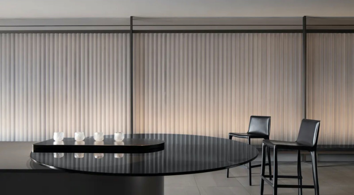 走廊承擔(dān)休息與公司分享的場(chǎng)所,活動(dòng)的多重舉辦賦予其多重身份,以體塊成為空間審美品質(zhì)的鋪墊。多重的東方元素,在體塊空間的對(duì)稱與縱深中, 成為銜接?xùn)|方美學(xué)與現(xiàn)代質(zhì)感的橋梁。