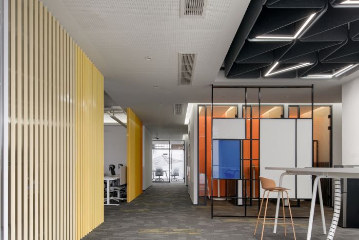 前臺空間使用了白色大理石材質,整體風格簡潔優雅。空間右側使用企業的品牌色黃色和橙色設置了一個線條隔斷,用于分隔入口區域和辦公區,保護企業辦公空間的隱私。空間讓來訪者感覺流暢現代,同時也充滿了企業的個性。
