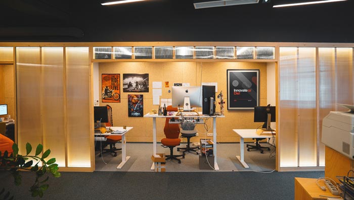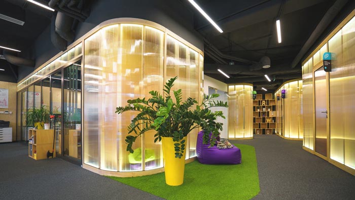 辦公場所的設計:此處主要為后期測試與前端工作人員辦公的場所,在這里開放與私人相互結合在一起,開放的空間讓員工如一家人一樣,私人的設計讓員工擁有自己獨立的辦公空間,這樣做的目的就是給每一個員工留下獨立思考的空間,消除空間的弊端,讓辦公更加有趣。