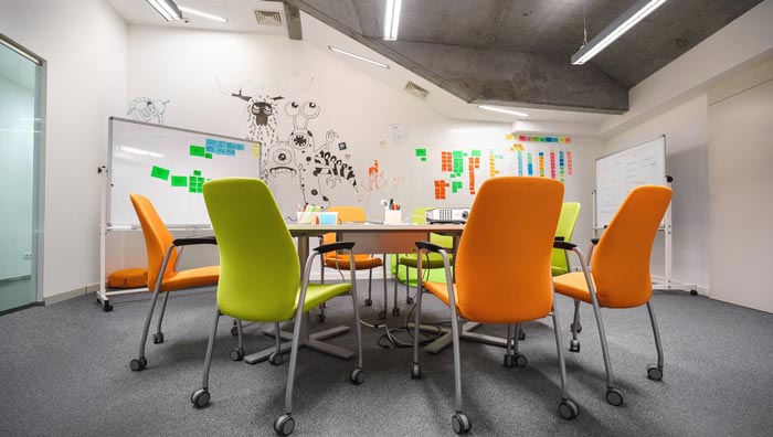 會議室的設計:會議桌被設計師安置在空間的中心,這樣做的目的就是為了突出空間的重點,四周也被設計師很好的加以利用,白色黑板、標簽墻壁的相互搭配,讓會議變得有趣起來,讓一切難題都被記錄下來,這樣可以提升企業的辦事效率,讓遺忘在此次無處遁形。