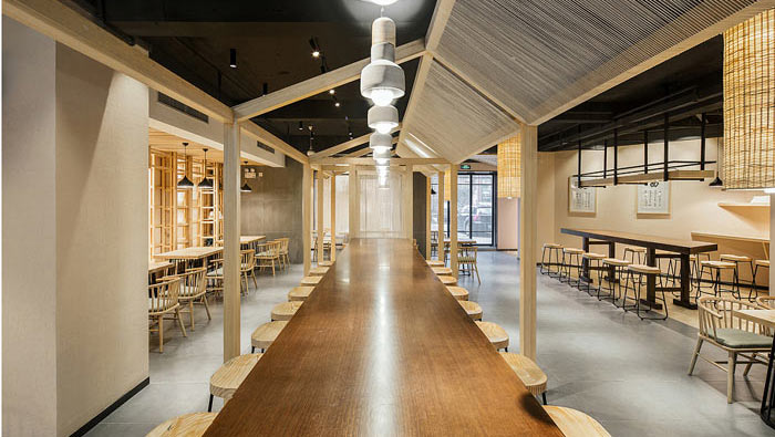 特色面館中間區域設計:中間區域由木制的框架構成,設計師在整體框架之下,又將空間分成幾個不同的區域,這樣做的目的就是希望將空間進行有效的劃分。