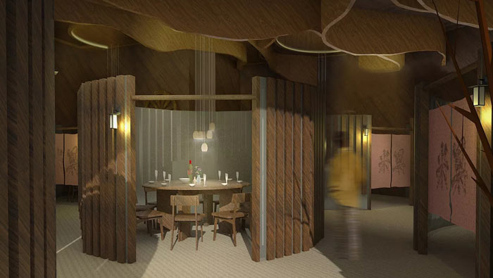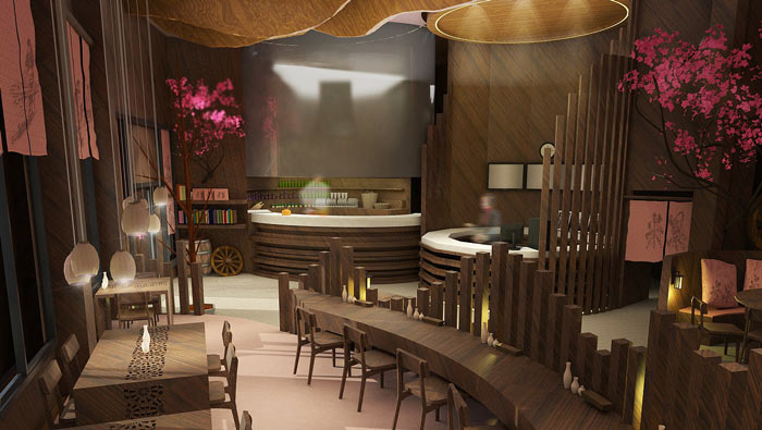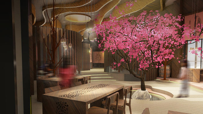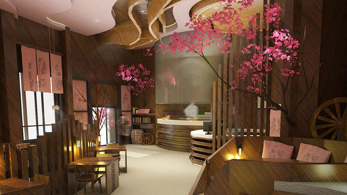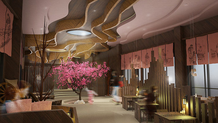 特色風(fēng)味餐廳氛圍設(shè)計(jì):在餐廳的中央有一顆桃花盛開的桃樹,客戶不管在哪里就餐,都可以看到這美好的一面,這也是設(shè)計(jì)師給客戶的福利,讓桃花朵朵香成為一種享受。