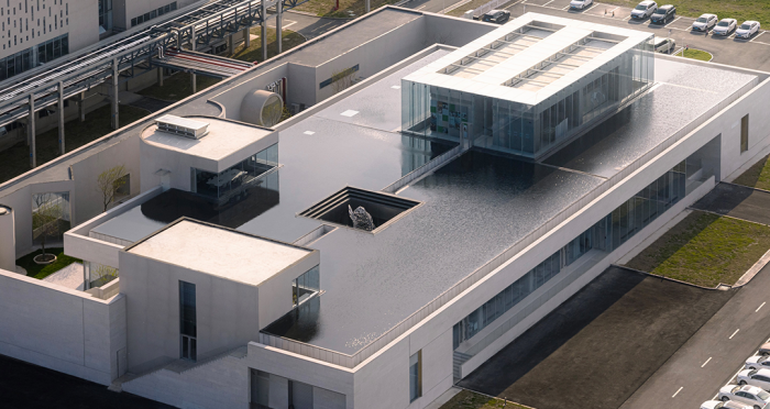 這是一個新能源材料行業的工業廠區的設計案例。廠區建筑以水為主題,水上的漣漪仿佛叩響生命與物質的存在邊界。生產車間的發酵恒溫水排走之前,在辦公區屋頂匯成淺池。