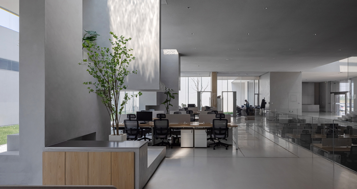 展廳、會客廳和行政會議室凸出水面,辦公區、會議室、員工食堂、廚房和多功能廳等大部分空間沉在水面以下,墻柱等構筑物和房間像細胞器一樣自由分布,具有極好的漫射采光。