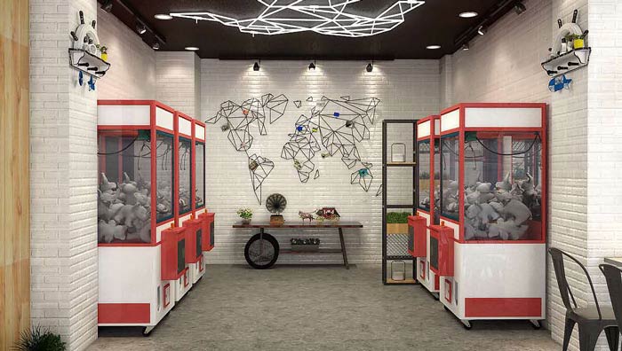 茶飲茶餐廳娃娃機設計:娃娃機是不占空間的娛樂項目,年輕人在這里休息的同時,也可以玩玩娃娃機娛樂一下,這樣可以有效的調節情緒,這里是客戶心靈的港灣。