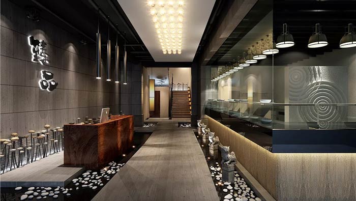 肥牛火鍋店前臺(tái)設(shè)計(jì):整個(gè)空間分為左、中、右,左邊為前臺(tái)接待,右邊為透明廚房,中間為過道,前臺(tái)與廚房安置在對(duì)立面,是為了讓客戶吃的放心與安心。