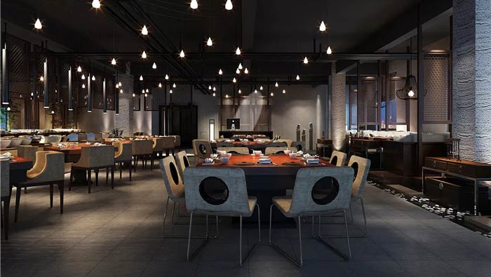 肥牛火鍋店一樓餐區(qū)設(shè)計(jì):在開放式的空間之中,設(shè)計(jì)師將餐桌有序的安置在空間之中,既要保證空間的暢通,又要保證相互之間不受影響,安靜的氛圍讓客戶吃的安心。