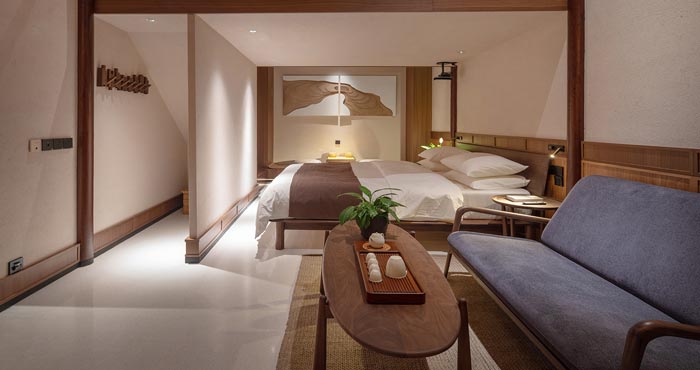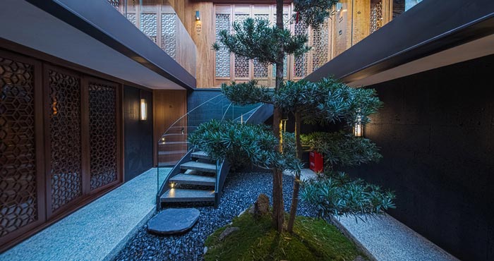 本次民宅民宿設計項目介紹結束,在設計中保留原建筑的柱網空間,同時以院落為中心,將空間劃分為四個客房區域,整體呈現中軸對稱的格局。