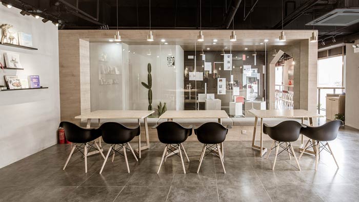 咖啡店卡座區(qū)設計:共享空間的交流盒子設計,讓這里成為各種文化和人群的聚合地,溫馨、安靜、理智、包容的空間,使的跨界文化的整合成為可能。