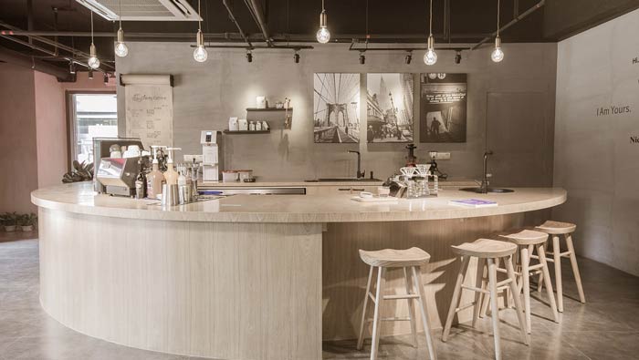 咖啡店吧臺區(qū)設計:半圓的吧臺區(qū),在很大程度上減少了對空間面積的影響,半圓吧臺集合了前臺、工作區(qū)域、休息區(qū)域,小空間被賦予大作用。