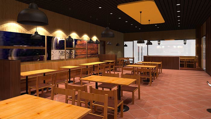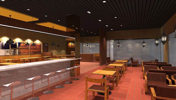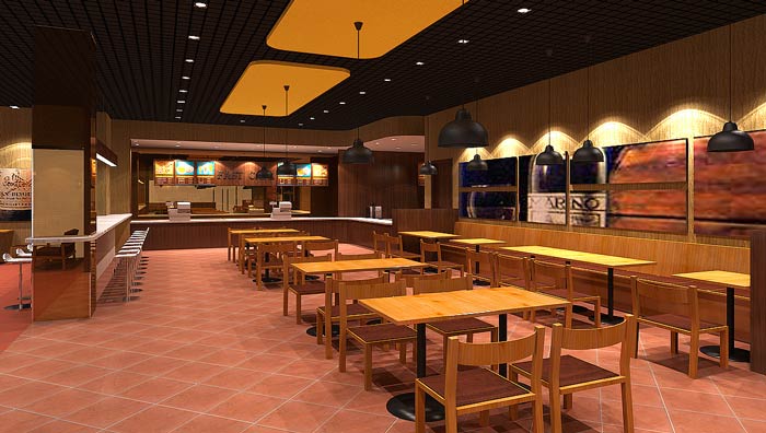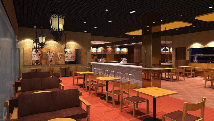 快餐店餐區(qū)裝修設(shè)計(jì):暖色系的燈光、暖色系的色彩設(shè)計(jì),給客戶一個(gè)穩(wěn)定的就餐環(huán)境,這里沒(méi)有用桔紅色,是希望給客戶一個(gè)安定的環(huán)境,業(yè)主不希望因?yàn)樯实拇碳ぃ斐煽蛻舫钥焓场?/span>