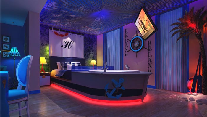 諾曼底號客房的設計:相信每一個人都會向往星辰大海,但是由于各種原因的限制,要實現非常困難,故此設計師希望將此情此景定格在空間之中,在這樣的空間中欣賞泰克尼克號的愛情,會有另外一番感悟,對于戀人之間有著更大的觸動,以此讓彼此更加珍惜彼此。