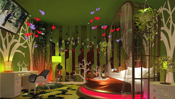 盛夏野趣客房的設計:童話世界是每一個童年的夢想,在童話中有白馬王子、小精靈、魔術、巫師等等一切,設計師希望為戀人們提供一個童話世界,讓他們在這里去感悟其中的酸甜苦辣,讓彼此化身為童話的身影,去經歷童話中的一切,讓情感得到一次質的升華。