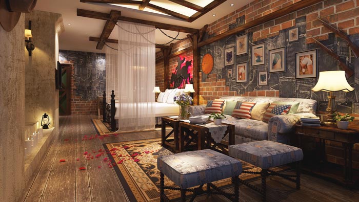 客房的設計:此處給人一種鄉村與家的感覺,這是因為設計師融合了鄉村的氣質與家的溫馨,設計師希望讓戀人在這里體會到異地他鄉的鄉情,在這里流露更多的對未來的期許,在這里戀人仿佛看到了美好的未來,對于未來也有了很好的憧憬,讓彼此攜手前行。