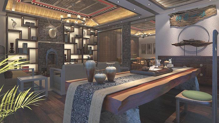 前臺(tái)的設(shè)計(jì):當(dāng)顧客進(jìn)入空間之后,仿佛進(jìn)入到一個(gè)茶室,同時(shí)中式的裝飾引入我們的眼簾,中式是中華文化的延伸,在這里顧客感受到的是博大精深的中華文化,這樣的環(huán)境可以讓人的心慢慢的放松下來(lái),在這里沒(méi)有繁雜的社會(huì)、沒(méi)有快速的生活、沒(méi)有吵雜的環(huán)境,有的只是安靜的氛圍,讓我們感受到生命的美好。