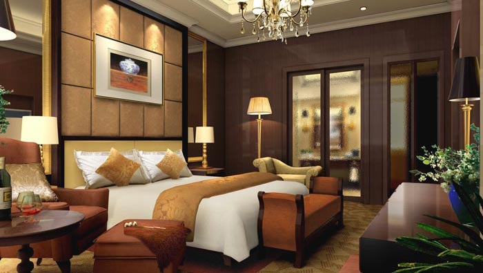 總統套房臥室的設計:靜怡是此處給人的感覺,在這里給人的感覺不僅是安靜,而更多的是文化的熏陶,床邊的躺椅讓他們躺在那里看書,閱讀書籍是一種享受,在設計師看來書籍是連接古代先賢的重要媒介,在這里顧客的心可以完全安靜下來,去體會心外無物的哲學問題。