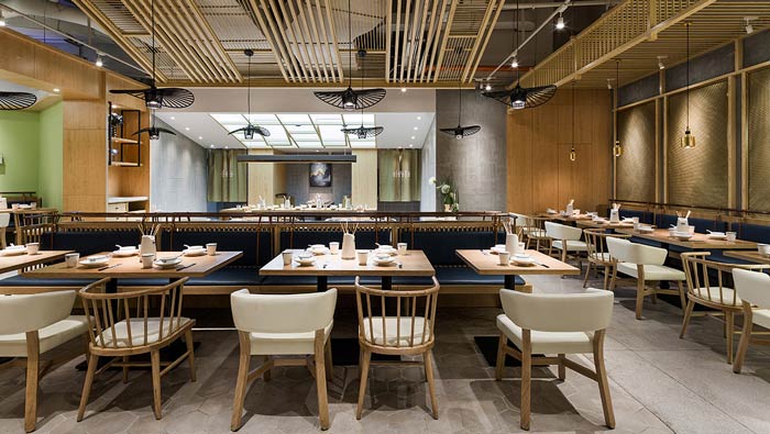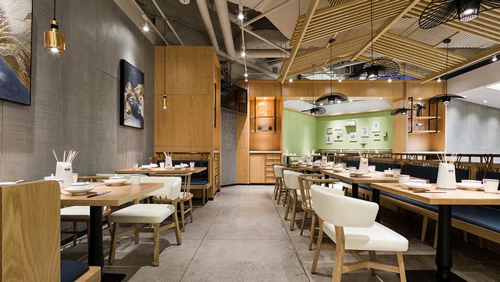 小吃店餐區(qū)裝修設計:屋檐餐區(qū)設計有效的包容了中間餐區(qū),類似于丁字形的餐區(qū)設計,是為了將空間打造的井然有序,一個有序的餐區(qū)設計,相信會為餐廳的發(fā)展提供助力。