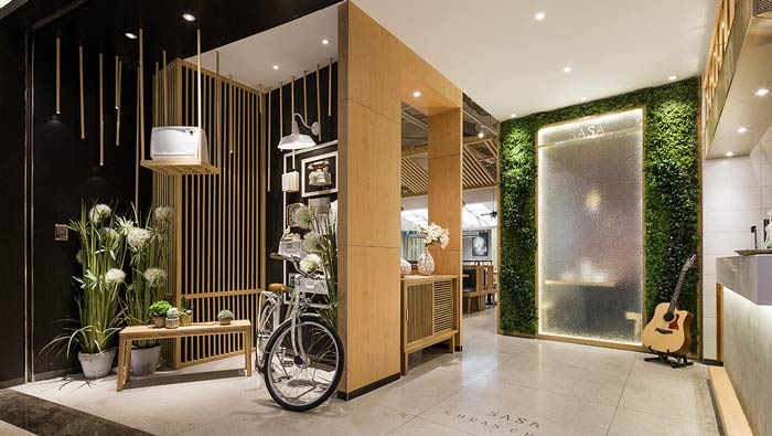 小吃店進門區(qū)裝修設計:盆栽為空間帶來了綠色,自行車為空間帶來了行動力,吉他為空間帶來了音樂氣息,一切的一切都旨在改變?nèi)藗兊挠^念,讓客戶在這里享受傳統(tǒng)美食。