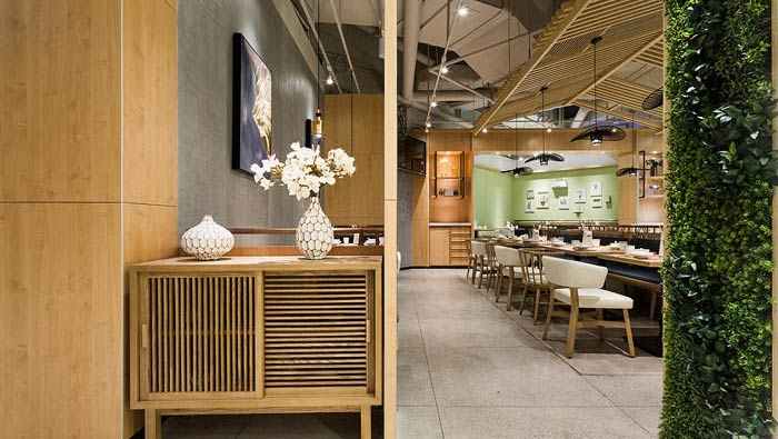 小吃店店面裝修設計:綠色是空間給人的第一感覺,素雅是空間給人的第二感覺,設計師就是要改變?nèi)藗儯瑢鹘y(tǒng)小吃臟亂差的固定形象,在這里傳統(tǒng)小吃被賦予了新的生命力。