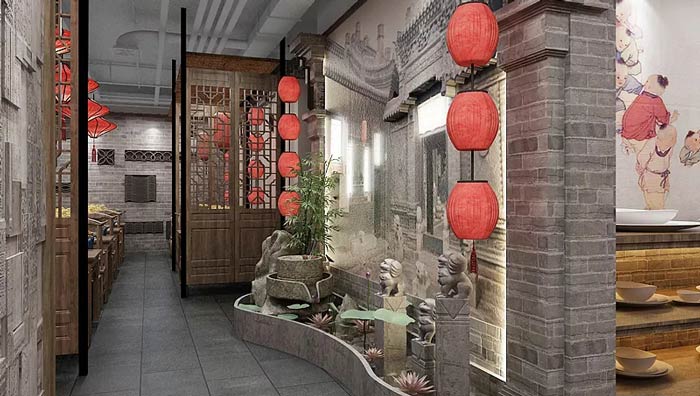中餐廳中庭設計:客戶從這里進入內部空間,這里有石獅子、荷花、燈籠、大宅,各種不同的中式元素匯聚在這里,給人一種回家的感覺,在文化回歸的大環境下,這樣的氛圍更受人喜歡。