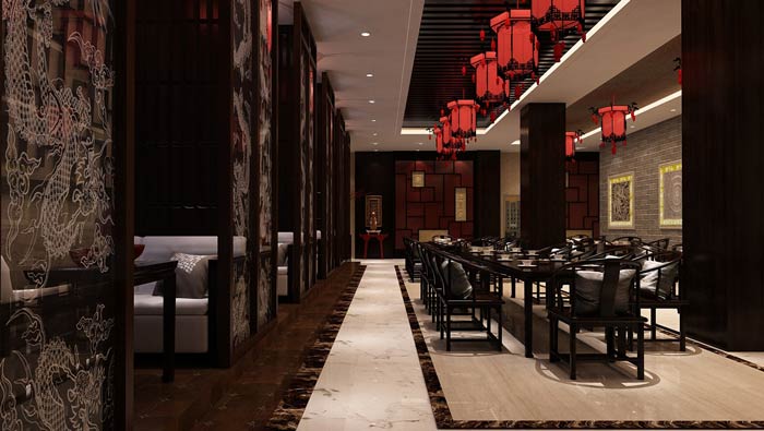 中餐廳餐區紋路設計:在餐區的隔斷上,紋著一條條的龍,龍在中國是神圣的,有龍鎮守在這里,清除了一切不好的,讓客戶在這里吃的放心、吃的安心、吃的貼心。