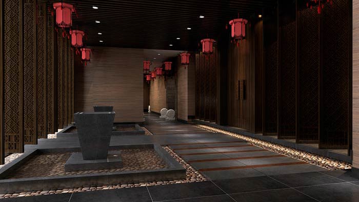 中餐廳過道設計:過道的燈光設計,設計師采用比明亮稍微幽暗,比幽暗稍微明亮的燈光設計,這樣的設計模式,是希望讓客戶感受到柳暗花明又一村的感覺。