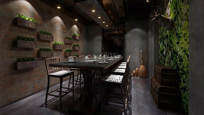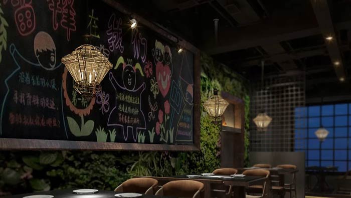 特色主題餐廳大廳設計:柔弱的燈光讓整個空間安靜了下來,這里沒有快速、沒有煩惱、沒有焦躁,有的只是一種消失已久的慢生活,在這里客戶的一切都慢了下來。