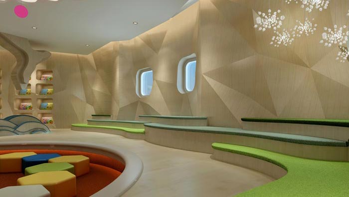 閱讀池的設(shè)計(jì):此處位于空間的正中央,整個(gè)閱讀池或坐或躺,既可以滿足孩子的閱讀,也可以讓孩子在此處玩耍,同時(shí)保證孩子的安全,階梯狀的座椅讓孩子可上可下,可以鍛煉孩子的獨(dú)立自主,同時(shí)此處可以欣賞到整個(gè)空間的景色,在此處本身就是一種享受。