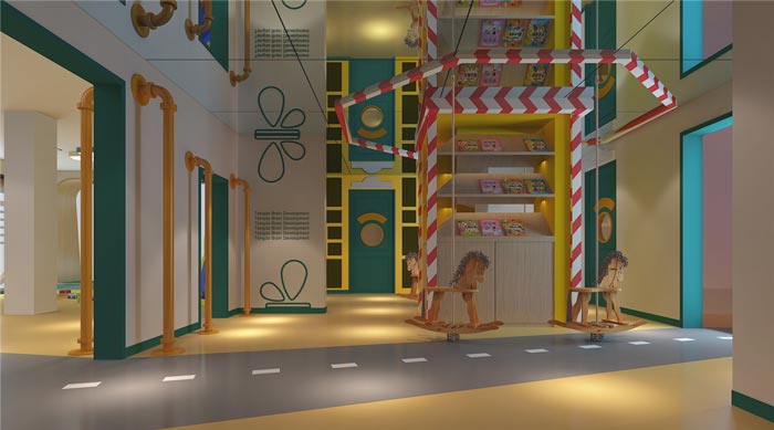 玩耍區(qū)域的設(shè)計:此處位于前臺空間的一側(cè),目的就是希望讓孩子們第一眼看到就喜歡這里,孩子在玩耍的過程中會學(xué)到很多東西,這也正是客戶所期待的教學(xué)模式,玩具放置在空間之中讓孩子們可以快樂的玩耍,動畫片的放映與玩耍相互結(jié)合起來,就是希望讓孩子在玩耍中不斷學(xué)習(xí)。